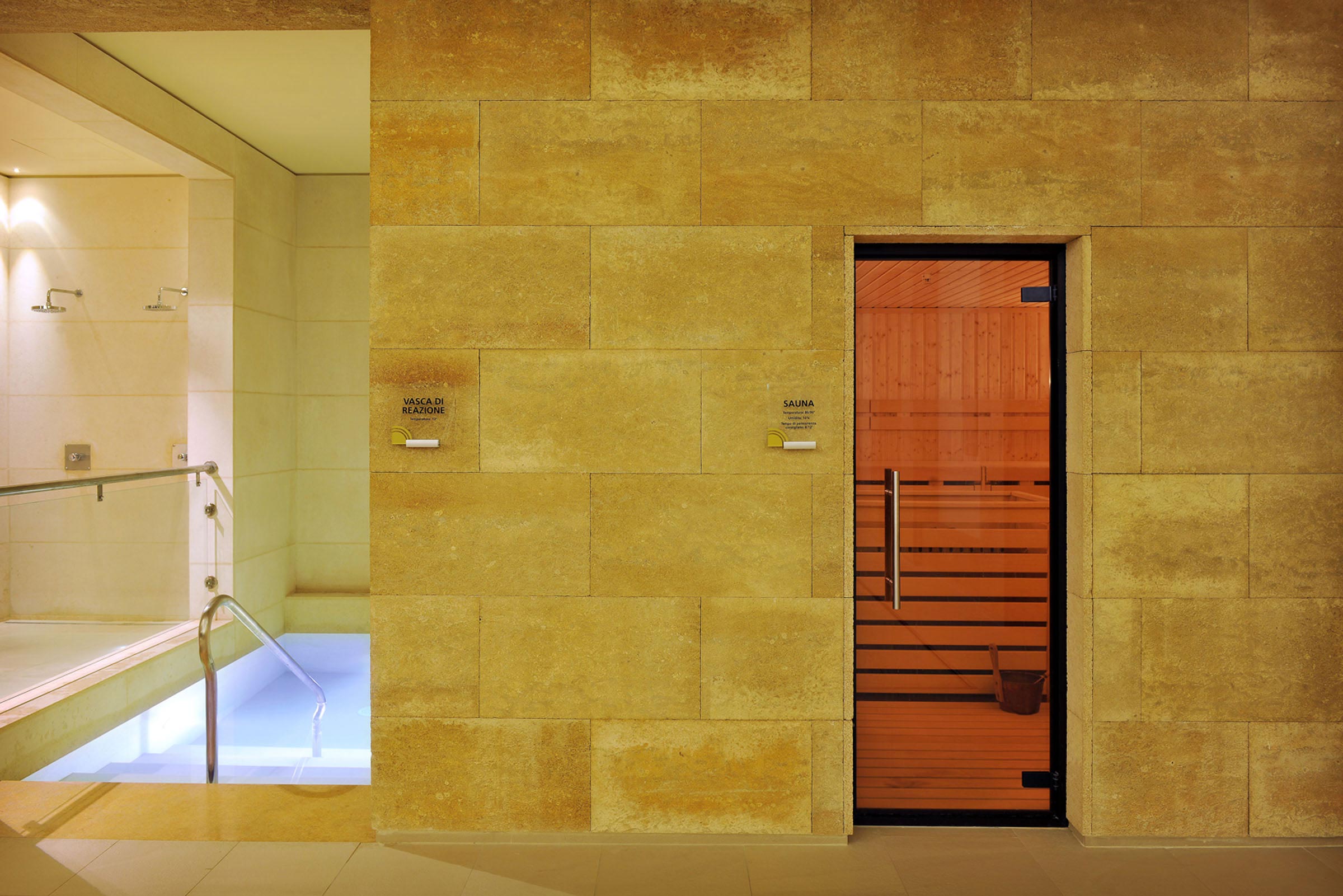 In this project by Stefano Fumagalli, the homogeneous nature of the colours, the light and the naturalness of the environment provide tranquillity and sensory harmony, helping guests to soothe mind and body. Pietra di Carparo and Terra di Minorca tie together all the areas, and accompany the visitor through the different rooms. The pool, with water jets and steps, looks as if it were hewn from a single block; at the edge the flooring drops down to house water collectors. Precise cutting deep into the material mitigate the impact of integrating machinery. The stone surface, which is sanded and roughened near the pool, is polished in the rest of the flooring. The same stone is also used in the showers, and follows the bends in the curved walls, showing the many ways in which stone can be used.