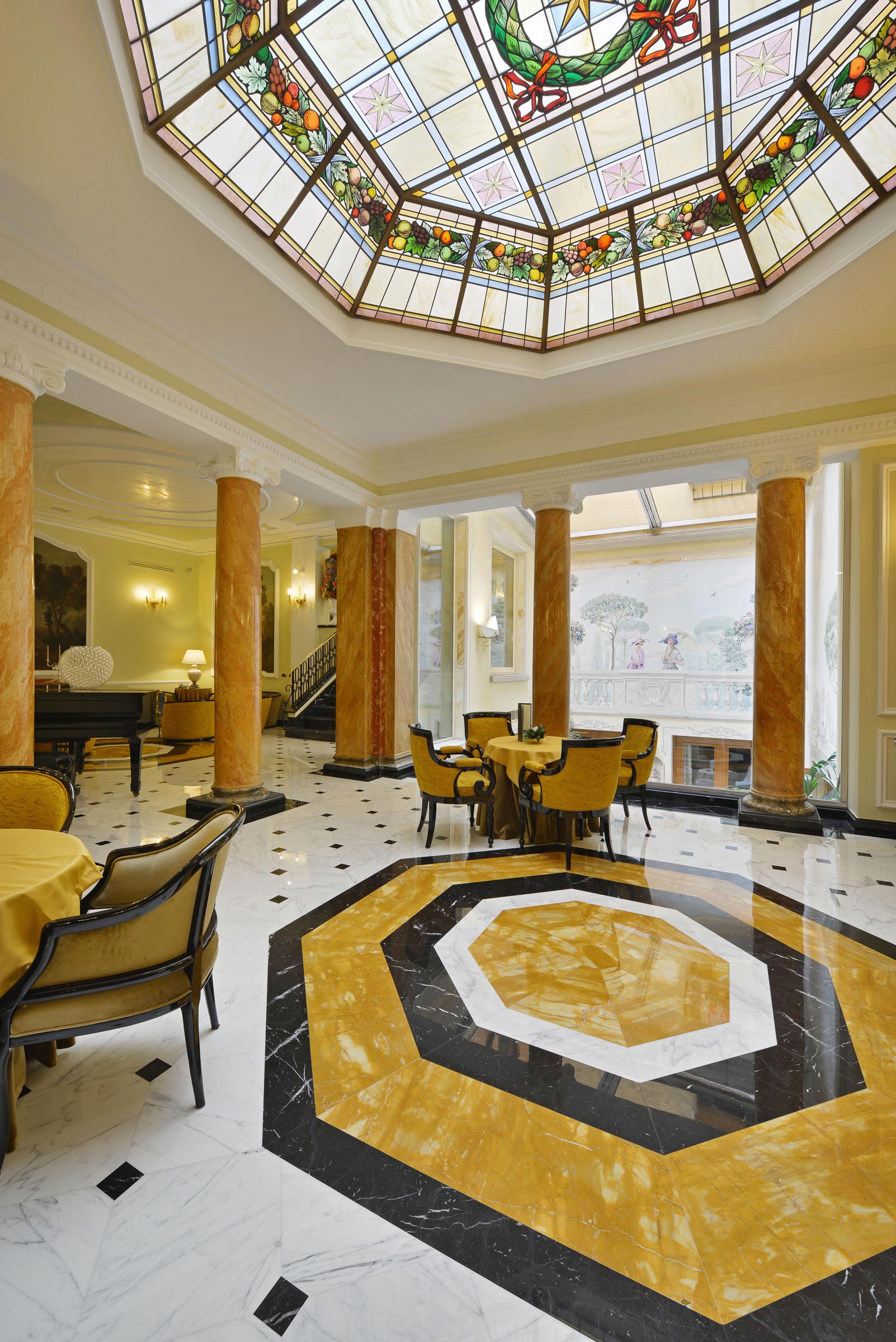 Standing in front of St.Peter's Cathedral, in Bologna, visitors encounter the impressive building that for a century has hosted one of Italy's most famous hotels. The Marmo Statuario flooring with its chequered squares of Nero Marquina enhances the elegance of the entrance hall, emphasised by the square-based pedestals decorated with geometrical stone patterns. The colonnade rests on these pedestals in alternating colours of sculpted white and polished veined marble. The tea room features Giallo di Siena and Nero Marquina flooring, and is illuminated by a heptagonal Liberty-style window. The bathrooms echo the antique spas of the nobility, with polished stone combined to create chromatic patterns, not only on the floors but also in the furnishings.